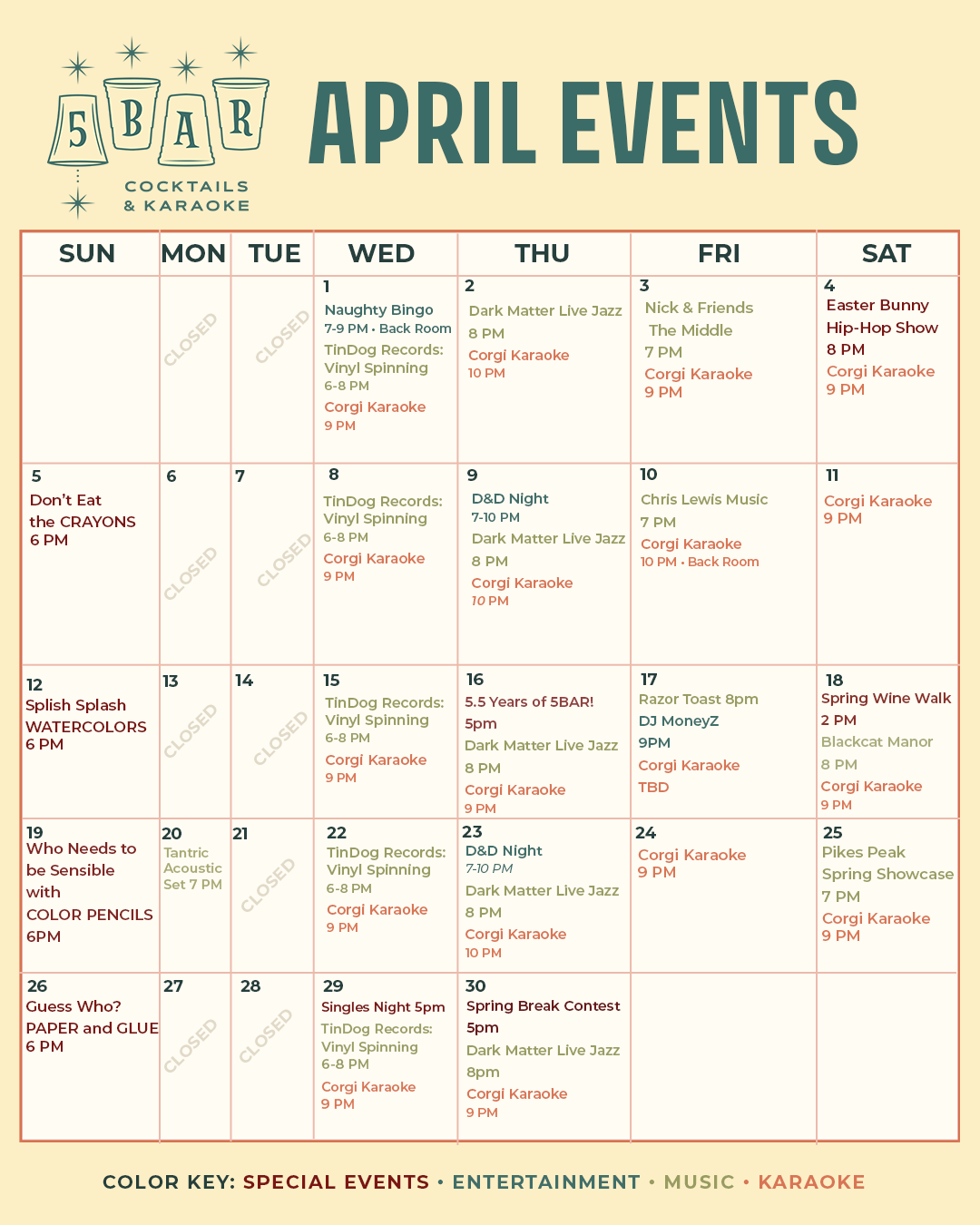 Public gatherings: Planning something casual? No reservation needed, unless you have a special request. P.S. We can usually add any special message on our bar sign!