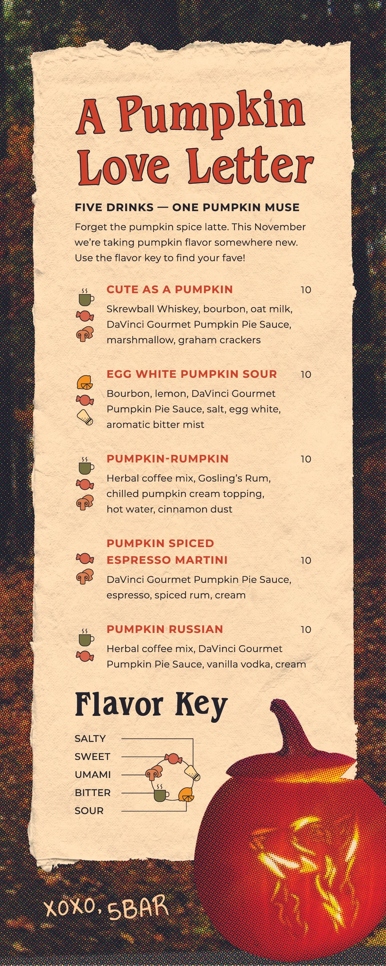 Check out our permanent menus, or get a limited time cocktail from our November menu: “A Pumpkin Love Letter” Beer & Seltzers Cocktails & Shots Low & No Alcohol