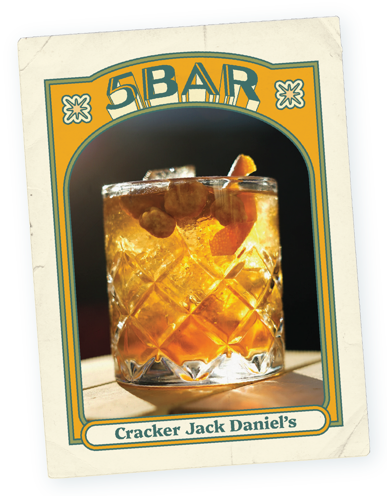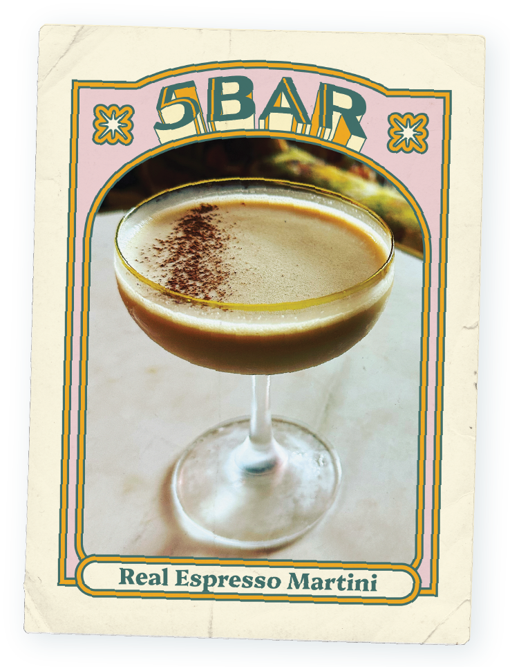 Levi (the founder of 5BAR) drew from his past working in Seattle, from his own coffee stand to working with the United States Barista Champion, and created this balance of coffee, booze, sweetness, and cream. A boozy latte like no other. We use fresh espresso that we pull at 5BAR. Check out our other coffee options there at any time.