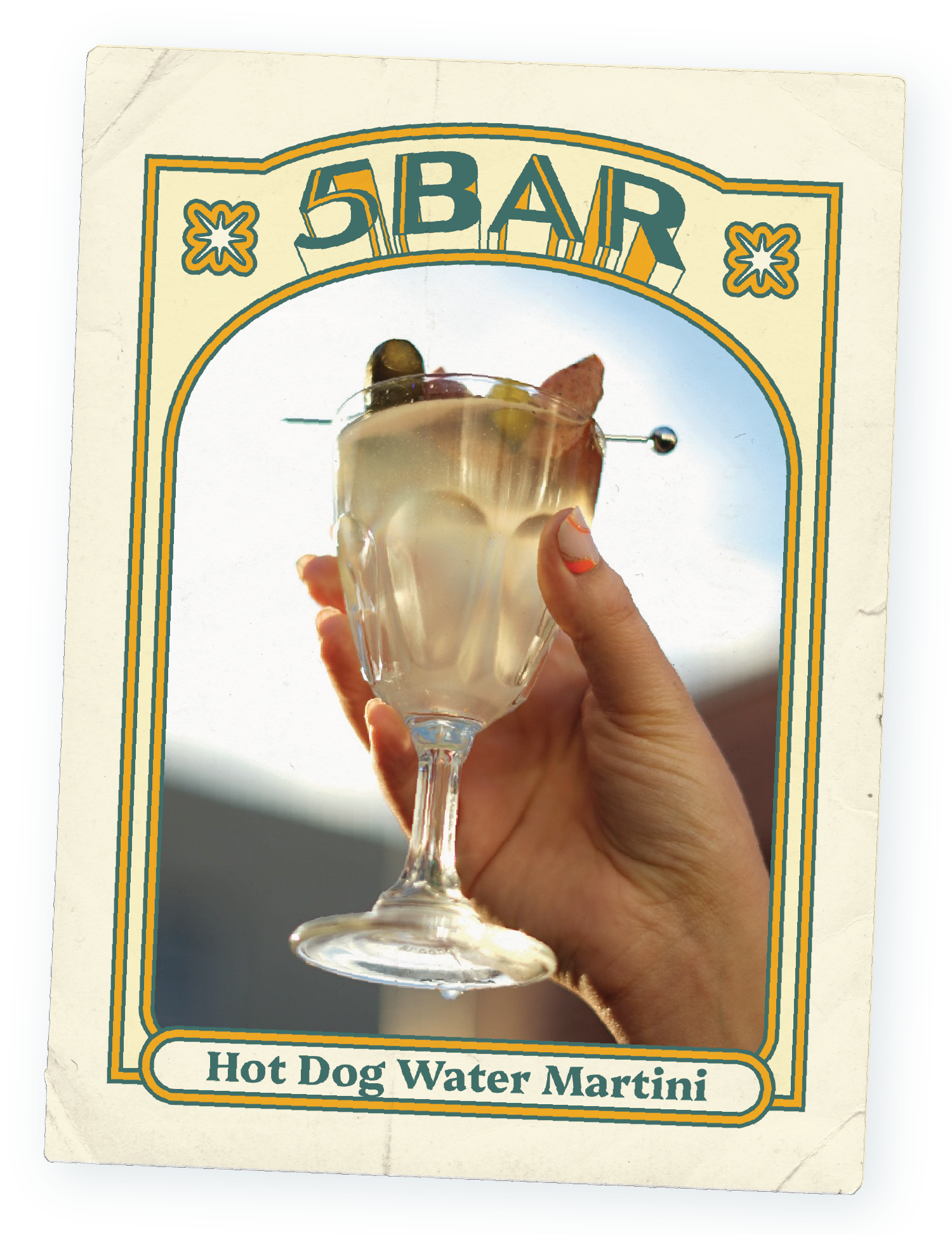 This extra savory dirty martini is made with Tito’s, kielbasa water, and olive brine. Don’t worry your tasty snack garnish includes a lil party weenie to really up the hot dog experience!